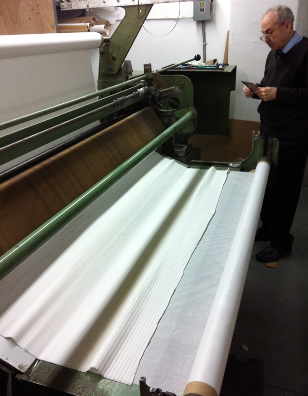 Did you know there are three methods used to pleat fabric. One, hand pleating. Folding the fabric pleat by pleat. Two, pattern pleating. This method employs the use of cardboard pattern, a pleater's board. The fabric is sandwiched between the cardboard pieces of the pattern and exposed to high heats, to set the pleat in the fabric. Three, machine pleating, above. The use of a pleating machine is the least labor intensive of all the other methods. It uses a machine for simpler pleats like a box or crystal pleat. Read more about the three methods on their blog.